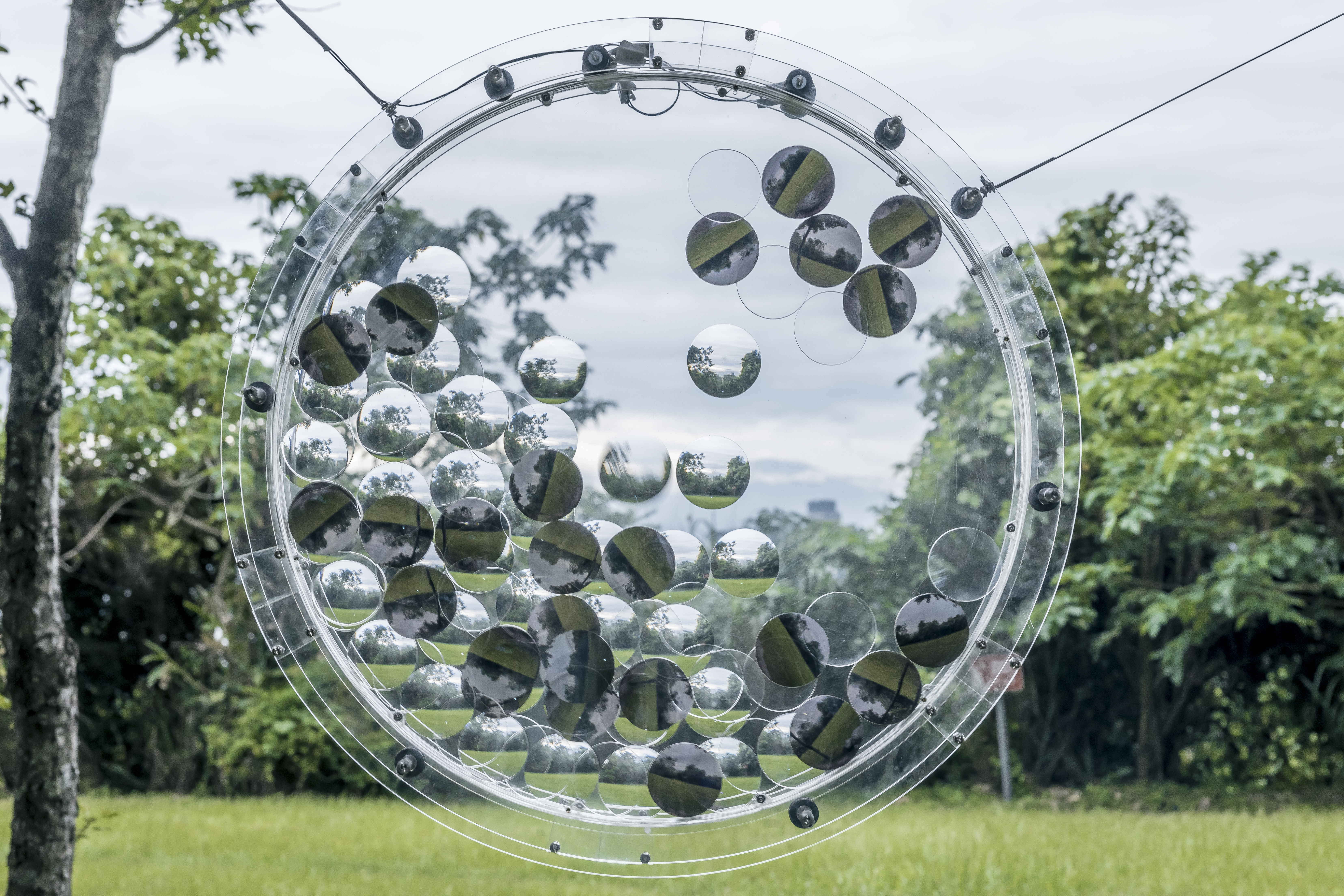 《景落萬象》是一件動力裝置,使用透鏡、照片和聲音探索真實與虛假的景觀。作品創造出視覺上的變化和衝突,使觀眾面臨真實與虛假之間的模糊界限。透過透鏡和照片的運用,重新詮釋景觀並挑戰觀眾對真實性和幻象的區分。掉落的聲音象徵景觀的失去和幻象的崩潰,加強觀眾對景觀真實性和虛假性的思考,創造出視覺和聽覺上的變化和衝突,挑戰真實與虛假之間的界限。